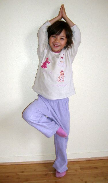 Je pratique le yoga depuis 7 ans. Vers l'âge de 3 ans, Hana a commencé à imiter mes positions. Ca la faisait rire! Alors, j'ai commencé à lui montrer trois ou quatre positions aux noms faciles à retenir: le chat, l'arbre, le pont, le cobra... Je me suis aperçue qu'après ces moments passés ensemble à se détendre, nous étions vraiment en harmonie toutes les deux. Je commence maintenant à lui apprendre des enchaînements plus complexes et elle aime vraiment...